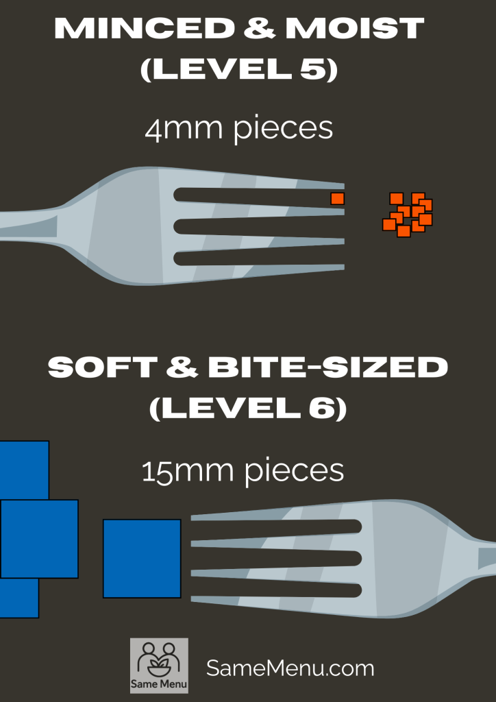 Level 5 Minced and Moist pieces will fit between the prongs/tines of the fork.
