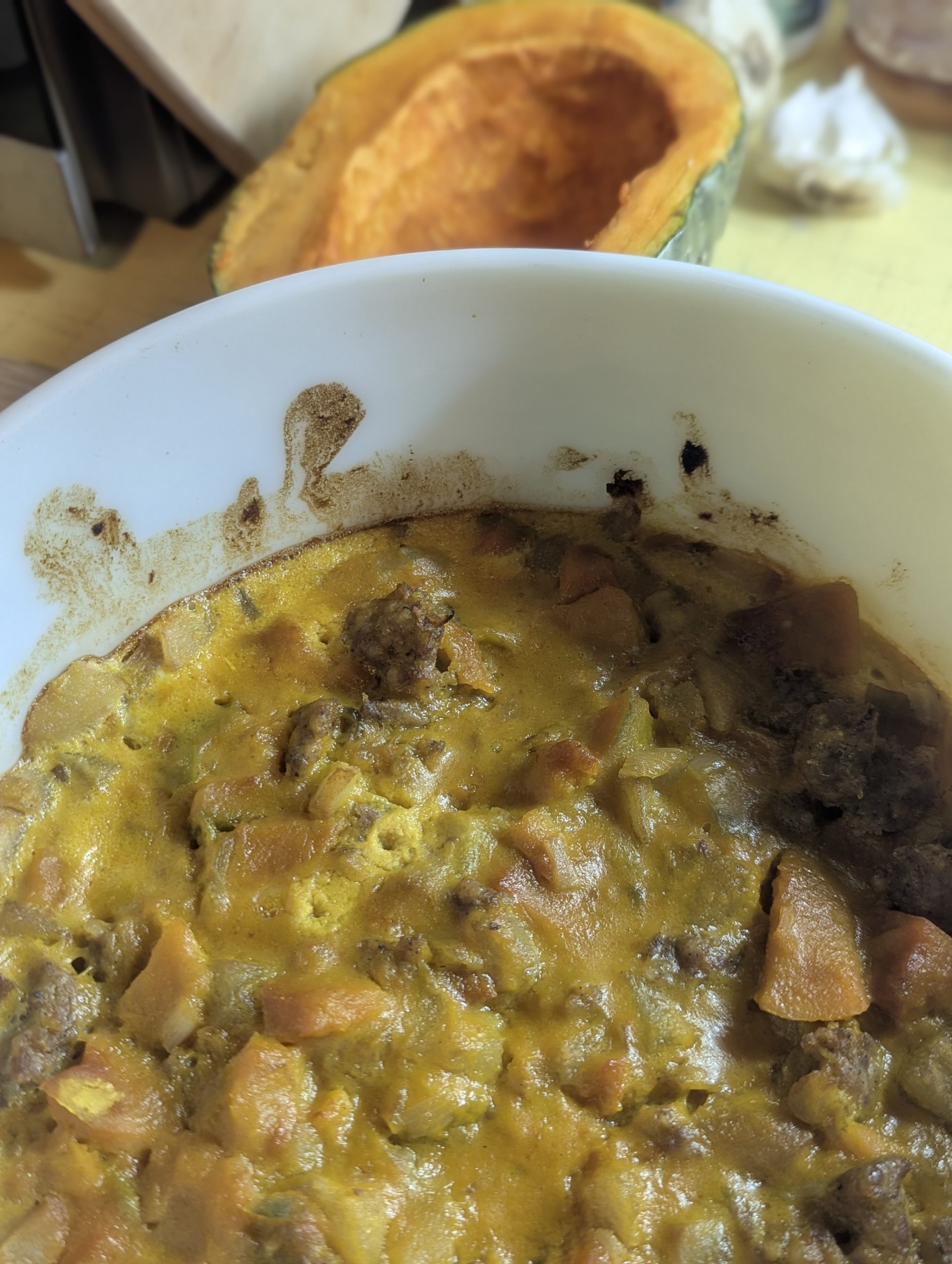 This casserole keeps the heart of a soup, the warmth, comfort, and moisture, but adds gentle body so that it can be served on a fork or spoon. Each element plays a role: The squash and apple provide natural sweetness. The mushrooms and sausage bring protein and umami, making it feel like a complete meal, especially with the quinoa.